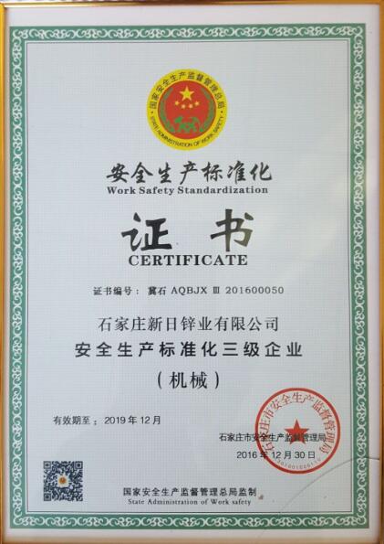 新日鋅業獲得“安全生產標準化獲得批準證書